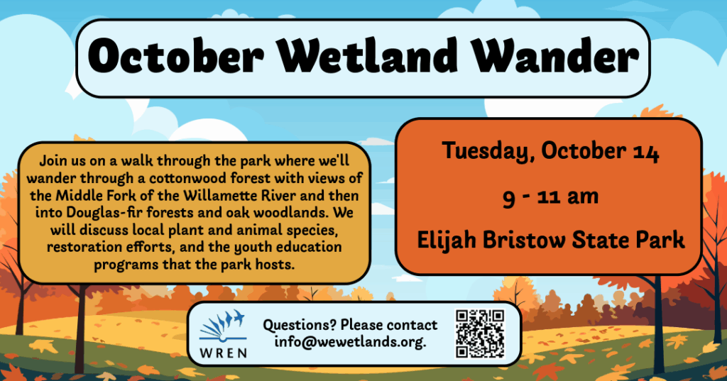 Rachel Schneiderman, Programs Coordinator at the Willamette Resources and Educational Network (WREN) at info@wewetlands.org or call 541-338-7047.