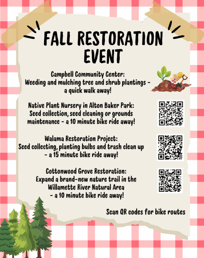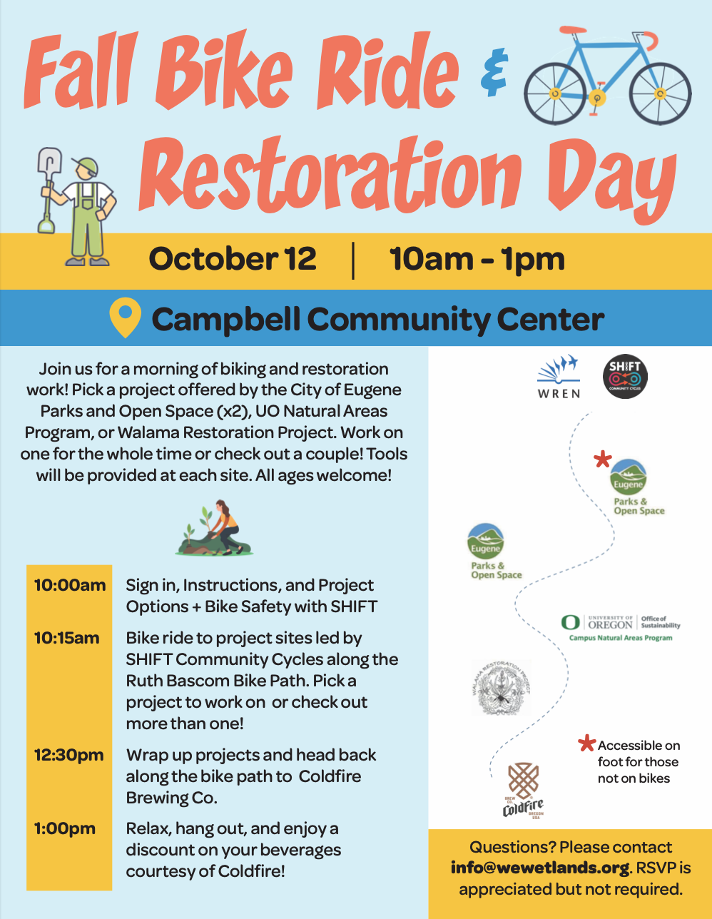 Join WREN, City of Eugene Parks and Open Space, SHIFT Community Cycles, Walama Restoration Project, University of Oregon Natural Areas Program, and Coldfire Brewing Co. for a community Bike Ride and Restoration Day along the Ruth Bascom Bike Path on Sunday, October 12 from 10am – 1pm! We will meet at the Campbell Community Center before being led out on a bike ride by SHIFT to the different project sites. Pick a project offered by one of the partners to work on or check out a couple. If you don’t have wheels, Parks and Open Space will have a project site just a short walk from our starting location. Tools will be provided at each site and all ages are welcome! We’ll finish things off at Coldfire Brewing Co., right next to the starting location, for discounted beverages and a good hang!