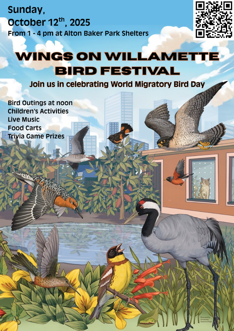 Several organizations will be there to share information with our community members about projects, how to get involved, and ways we can help birds, pollinators, and environmental health. Organizations expected at the event are Coast to Cascades Bird Alliance, Cascades Raptor Center, Mt Pisgah Arboretum, McKenzie River Trust, Beyond Toxics, WREN, Nearby Nature, Wild Birds Unlimited, Lane County Queer Birders, and Willamette River Keepers. Many thanks to Bird City Oregon and UWSWCD for their support of the festival! Look for more details including a map and bird walk descriptions at Wings on Willamette.