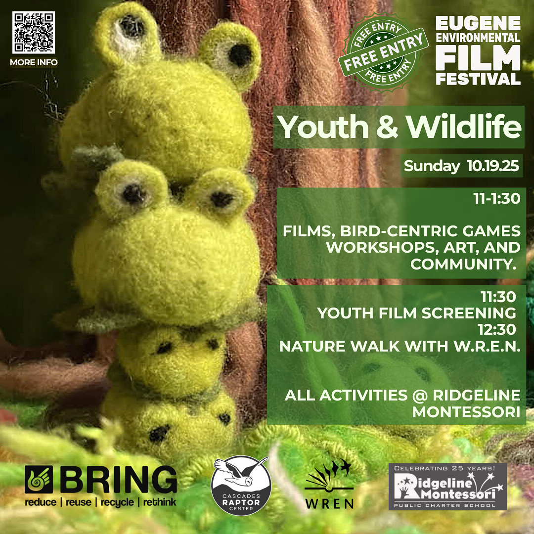 Join the games and mission-filled nature walk and explore the wonders of local wildlife with WREN.! Get creative with upcycled art projects led by BRING! Check out bird-centric artifacts from the Cascades Raptor Center and learn about our feathered neighbors! Enjoy youth-friendly short films that inspire action and wonder.