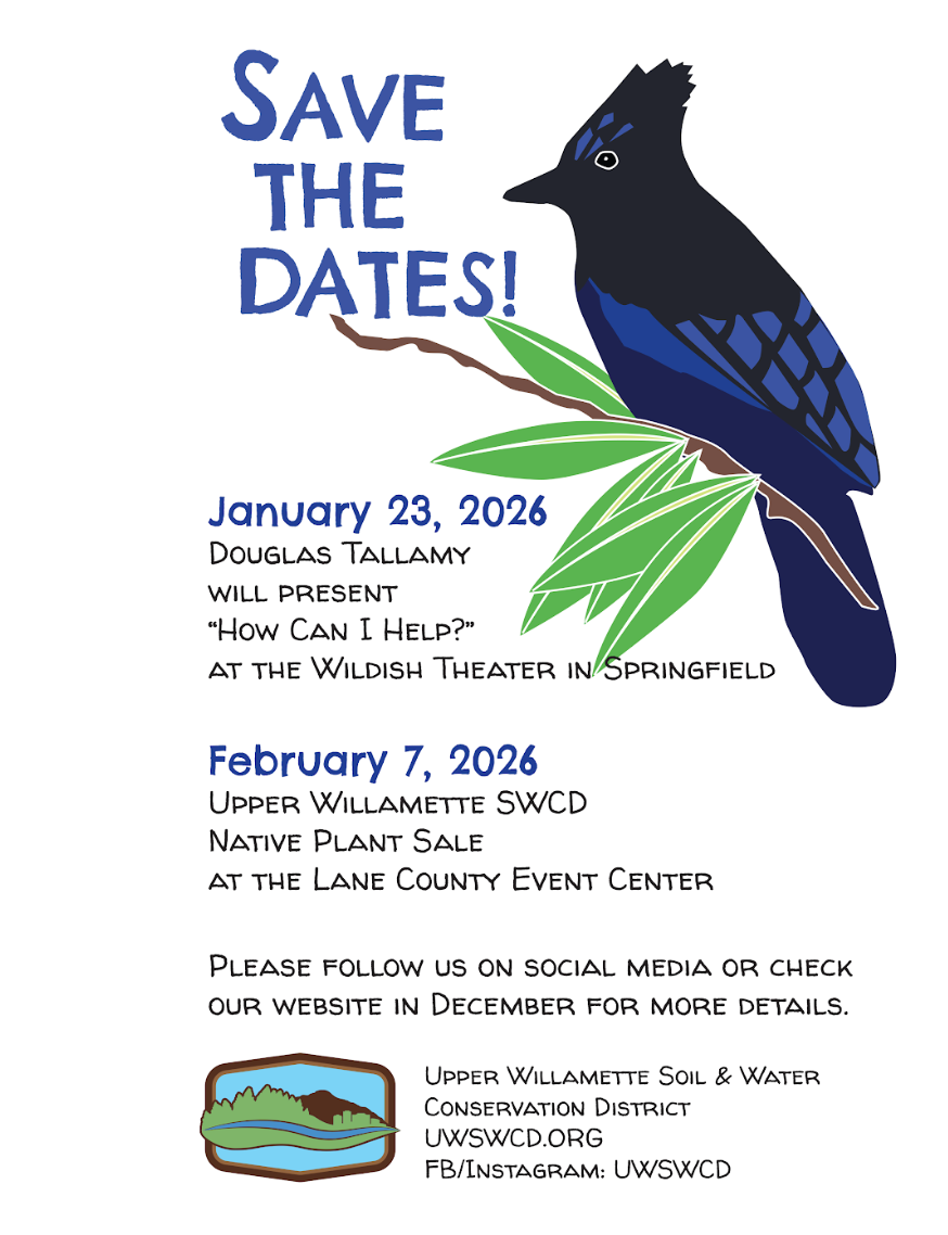 Interested in taking next steps to bring conservation into your home’s yard and garden? Upper Willamette SWCD are hosting a Native Plant Sale on Saturday, February 7th, 2026, at the Lane Events Center Auditorium, featuring a wide variety of locally native species and seeds. Visit their website to learn more and place your order!