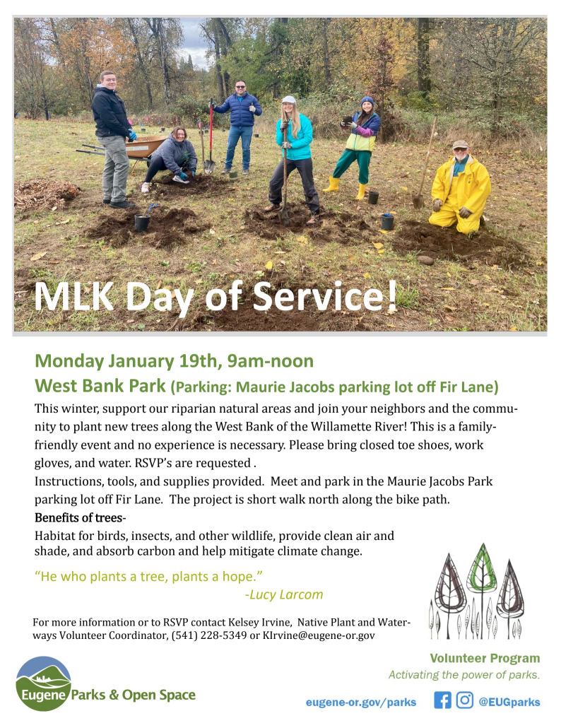 For more information or to RSVP, contact Kelsey Irvine, Native Plant and Waterways Volunteer Coordinator, at (541) 228-5349 or KIrvine@eugene-or.gov.